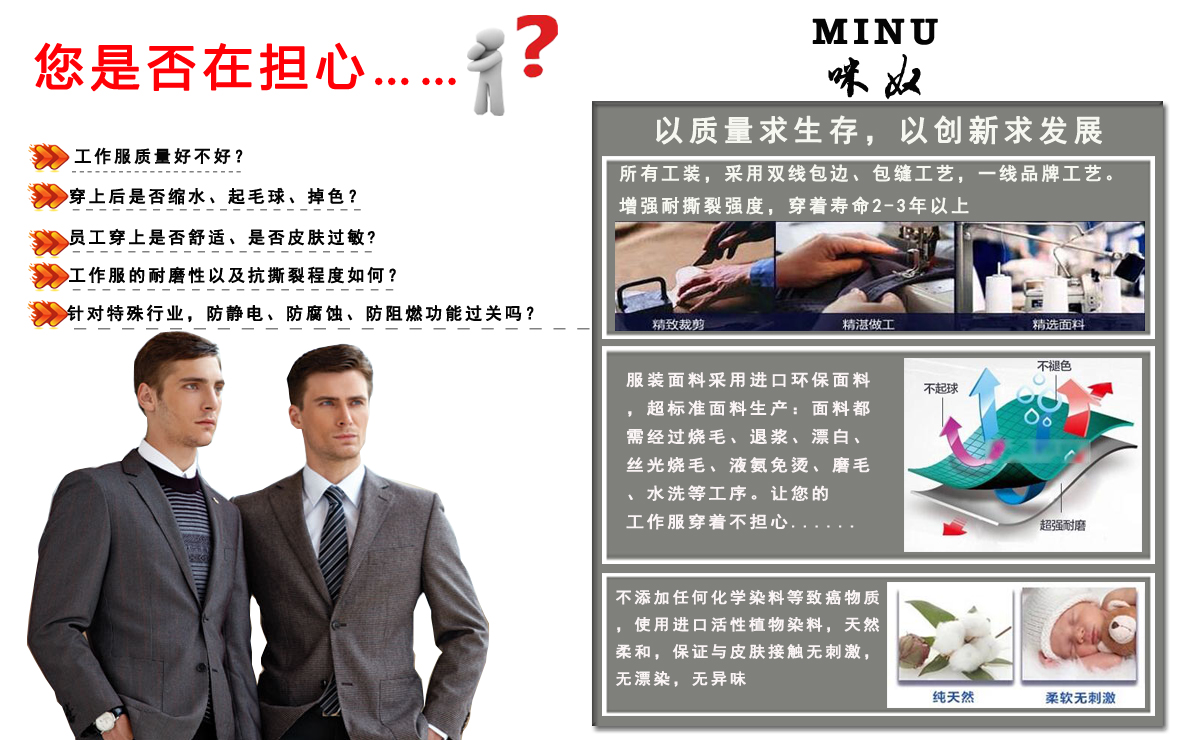 咪奴服裝由技術(shù)精湛、經(jīng)驗豐富的設(shè)計團(tuán)隊,定期參加國際服裝展,抓取當(dāng)季服裝行業(yè)流行趨勢及元素。結(jié)合制服特點進(jìn)行設(shè)計制作,讓您企業(yè)工服永不落伍。